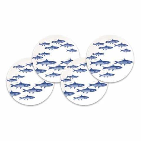 Schools of fish in brilliant blue drift across this set of small plates, adding a coastal touch to your entertaining. Made from creamy white premium porcelain these plates are a whimsical take on life amidst the ocean’s currents.