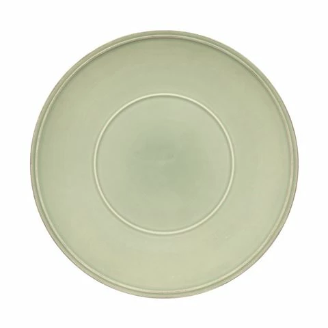 Featuring a subtle grooved edge hand-painted by skilled artisans, it retains a new attitude in stoneware for entertaining or casual everyday use.