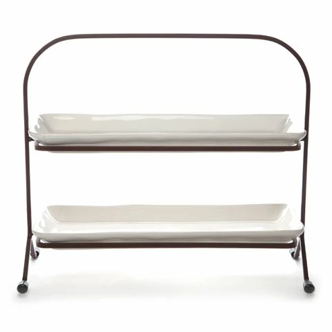 This two-tier serving stand, which has a rustic charm thanks to its chic distressed-look metal frame, is the welcome addition to your buffet meals or cocktail parties. Itβs also handy for cocktail parties when you may load it up with drinks, canapes and ice buckets so everything is ready at your reach. The two white trays will also make your presentations look crisp and fresh.