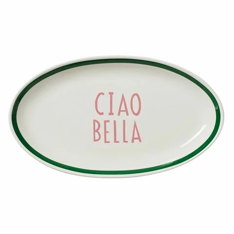 In The Roundhouse’s Italian Words collection was created by cool Australian artist, Daimon Downey to make a style statement. The Ciao Bella Oval Platter with a snappy green border and pink lettering, will complement bellissimo creations. Just place on a garden table beneath the trees and prop with a round of bellinis to set the mood for fun.