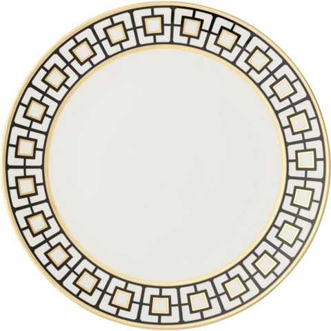 - Stunning flat plate with an intricate black, gold and white geometric border