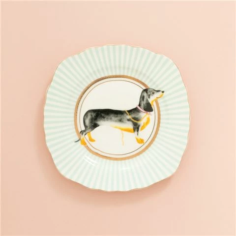 The Sausage Dog Cake Plate features charming illustrations by Yvonne Ellen herself, adorned with pastel colours and gold detailing. The square shape gives this plate a unique, vintage effect. The perfect addition for a tea party filled with whimsy and colour.